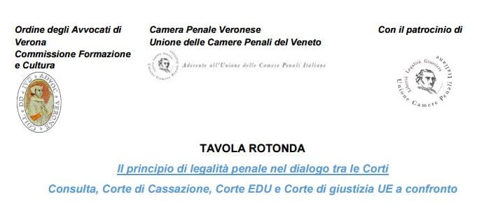 Si terrà il 22 giugno 2017, dalle ore 15 alle ore 18 presso la Sala Convegni della Banca Popolare di Verona, Banco BPM, in Via San Cosimo, 10 a Verona una tavola rotonda sul tema: “Il principio di legalità penale nel dialogo tra le Corti. Consulta, Corte di Cassazione, Corte EDU e Corte di Giustizia UE a confronto”, organizzato dall’Ordine degli Avvocati di Verona con la sua Commissione Formazione e Cultura, dalla Camera Penale Veronese con l’Unione delle Camere Penali del Veneto ed il patrocinio dell’Unione delle Camere Penali Italiane.
