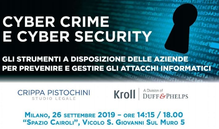 Si terrà giovedì 26 settembre 2019, dalle 14.30 alle 18.30, presso lo Spazio Cairoli (Vicolo S. Giovanni sul Muro 5), l’evento organizzato dallo Studio Legale Crippa Pistochini e da Kroll Italia, con la media partnership di 4CLegal e della rivista Giurisprudenza Penale, dal titolo ‘Cyber crime e cyber security. Gli strumenti a disposizione delle aziende per prevenire e gestire gli attacchi informatici‘.