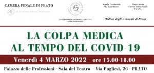 Venerdì 4 marzo 2022, presso la Sala del Teatro del Palazzo delle Professioni di Prato (Via Pugliesi, 26), si svolgerà, a partire dalle ore 15,00, il convegno, organizzato dalla Camera Penale di Prato, dal Centro studi giuridici e sociali “Aldo Marongiu”, dall’Ordine degli Avvocati di Prato, dalla Scuola Territoriale “G. Guarducci” e dall’Osservatorio Corte costituzionale dell’Unione delle Camere Penali Italiane, dal titolo “La colpa medica al tempo del Covid-19”.