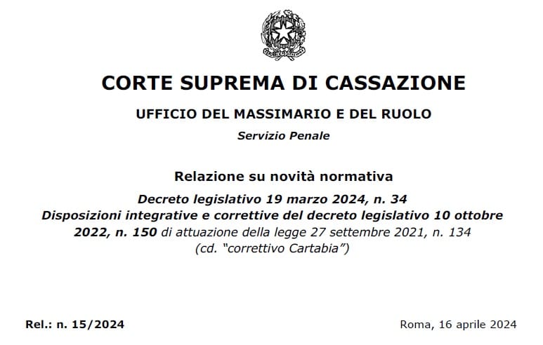 Segnaliamo ai lettori, in merito ai cd. “correttivi” alla riforma Cartabia, la relazione dell’Ufficio del Massimario e del Ruolo della Corte di cassazione – redattore il dott. Aldo Natalini – avente ad oggetto il Decreto legislativo 19 marzo 2024, n. 31 (“Disposizioni integrative e correttive del decreto legislativo 10 ottobre 2022, n. 150 di attuazione della legge 27 settembre 2021, n. 134“).