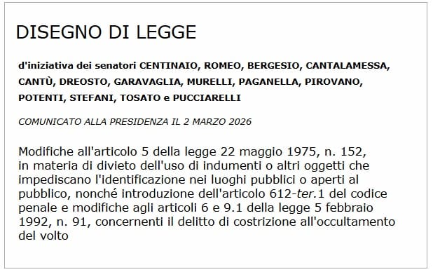 Il testo del disegno di legge in tema di “uso di indumenti o altri oggetti che impediscano l’identificazione” (occultamento del volto)
