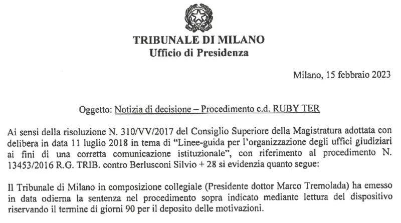 Processo “Ruby-ter”: il comunicato del Tribunale di Milano